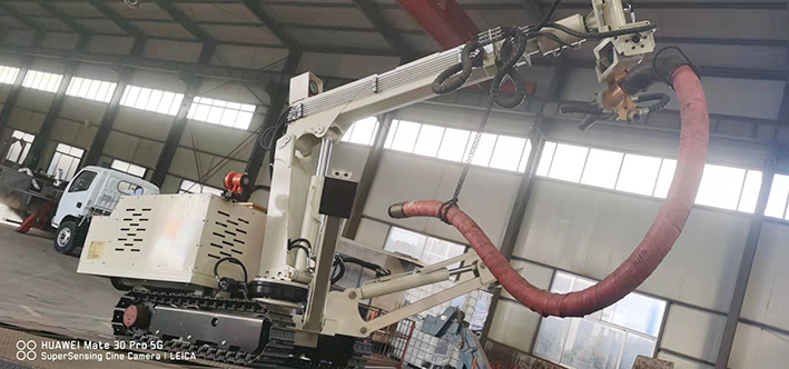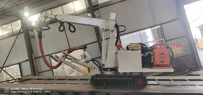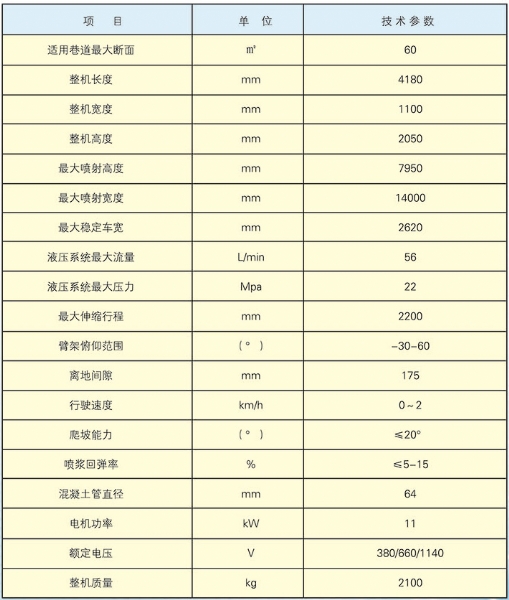 CPF-6OLY型礦用混凝土輔助噴射車(chē)(以下簡(jiǎn)稱(chēng)噴漿機(jī)械手)主要用于煤礦井下煤巷、半煤巷、全巖石掘進(jìn)巷道與混凝土噴射機(jī)配套使用,代替人工噴漿作業(yè),滿(mǎn)足噴漿工藝要求,整機(jī)小巧、靈活、耐用、適應(yīng)能力強(qiáng),可用于大型噴漿機(jī)組無(wú)法進(jìn)入的巷道,實(shí)現(xiàn)噴漿無(wú)線(xiàn)操作、機(jī)械化作業(yè),減輕人工噴射勞動(dòng)強(qiáng)度大的問(wèn)題。整機(jī)完全采用無(wú)線(xiàn)遙控操作、液壓控制,工作性能安全可靠。下車(chē)液壓系統(tǒng)負(fù)責(zé)行走、上車(chē)液壓系統(tǒng)負(fù)責(zé)噴射,上下車(chē)動(dòng)作手動(dòng)切換,防止誤操作。整機(jī)具有結(jié)構(gòu)穩(wěn)定可靠,動(dòng)作平穩(wěn),噴射范圍大,自由度多,遙控操作靈活,噴射平整度好,回彈少,噴射效率高、施工質(zhì)量好,可實(shí)現(xiàn)遠(yuǎn)程控制,操作人員可位于在可視情況好、粉塵濃度少,較為安全的位置操作,保證使用人員安全。