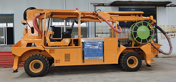 3、同步速凝劑添加采用進口軟管泵,液壓馬達驅動,電比例流量閥調節(jié)轉速以達到調節(jié)流量的目的,液晶顯示和觸屏設置速凝劑添加比例,且在屏幕和器上均可隨時修改設置,速凝劑的添加量緊隨砼的泵送量同步變化而保持添加比例按設定值運行,這些均由可編程控制器控制。由此可實現對速凝劑添加量的控制,以達到效果,回彈和節(jié)約速凝劑的目的。機器上配有容積為1.0m³的耐腐蝕塑料材質的速凝劑容器,速凝劑軟管泵也可從外部容器中抽吸速凝劑,根據實際情況可方便地進行切換。